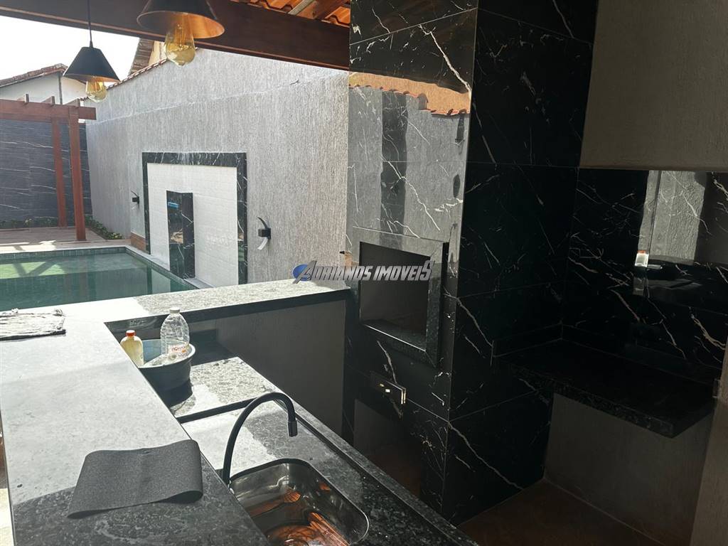 Casa com piscina , espaço gourmet com churrasqueira a carvão pia de apoio em granito .